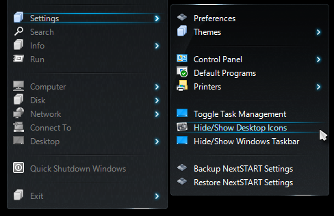 If you just want to show/hide Desktop icons, in my NextSTART menu (which is relatively default), there's a "Hide/Show Desktop Icons" in the Settings sub-menu.