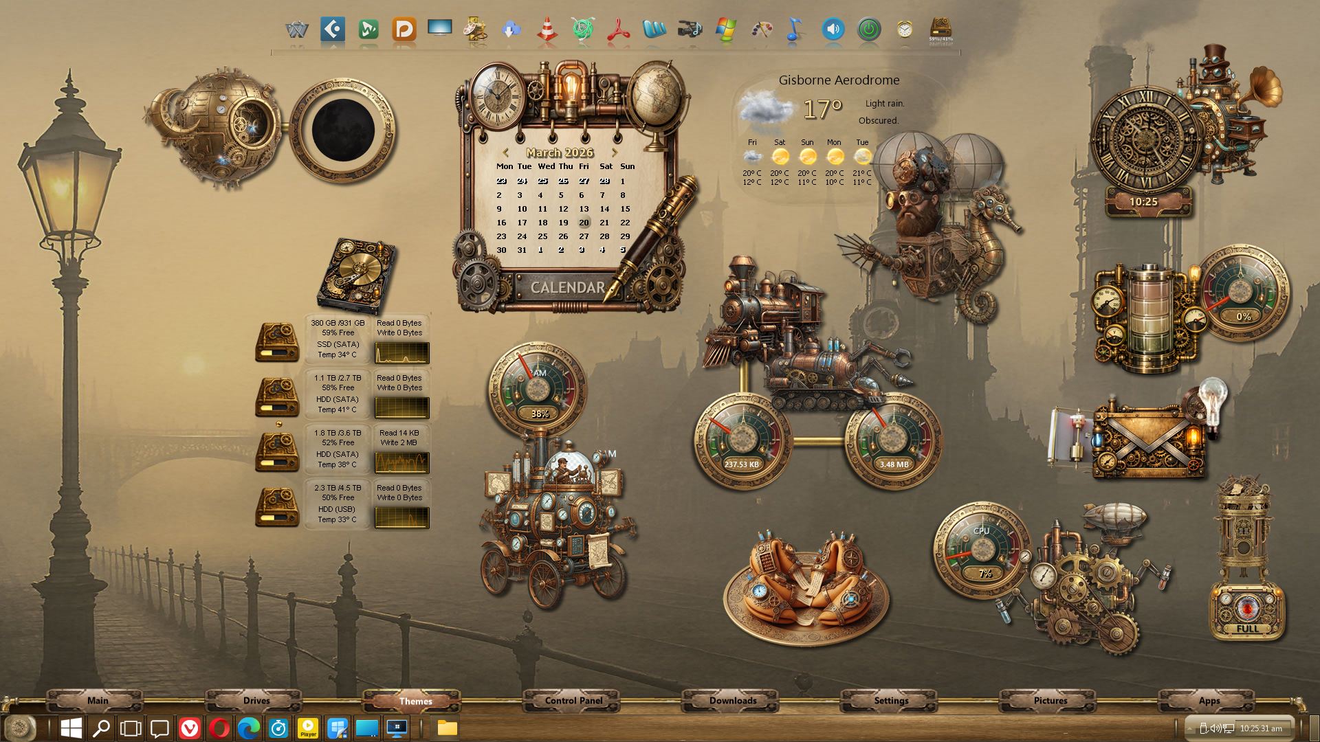 THE THEME important info - I enclosed a couple to show why I have to do something else because if I keep doing with the way I am going, I am only going to get pissed off more with resizing what I truthfully should not need to but the application has to be done that way, so I need to find another avenue to explore this and at this point I have no idea what. The detail, well if you look at the gauge and the camera which did not make the final cut, you might have some idea of why I need to find something else to do and why I get frustrated by looking at the gauges in the final Winstep “Steampunky” theme. If you look closely, the gauge arm I originally designed is not the final arm because it cannot be seen except as a pixellated mess. I left it on the main image if you also look closely. That should explain a little. I will not be uploading this. It is definitely NOT functional, I realised I had created it for the artistic aspects and in the process became increasingly annoyed with quality loss shrinking them. If you look very closely you might perhaps see detail within detail in the clock and others... Lost in translation as well unfortunately. This is aesthetic not so much aimed at functional ... So the University educated functional side of me is forever in conflict with the performance and practical application side of me when it comes to doing these themes. I am sick of having to sacrifice quality for functionality in my own designs for these themes, it is that uncomplicated, and that is my problem, not anyone else's.