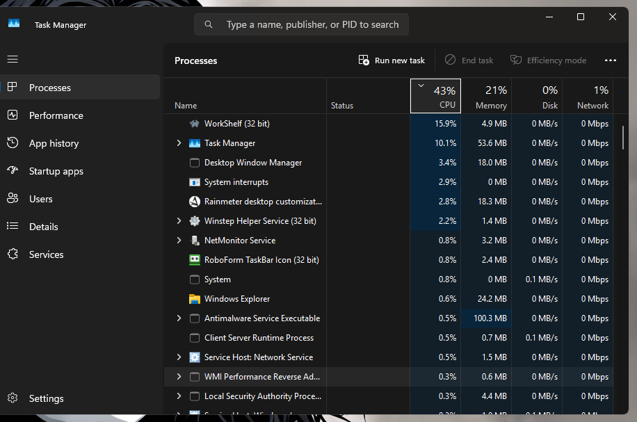 It's an issue with 24H2. Ran under all the previous win 11 builds without an issue. As you, I have used rainmeter for an eternity, and it's not that. In fact I booted with just Microsoft services and workshelf enabled, and it was running between 10-17%. It's not massive, but compared to 23H2 which was like 2%. Revert for now back to 23H2, and maybe clean install later.